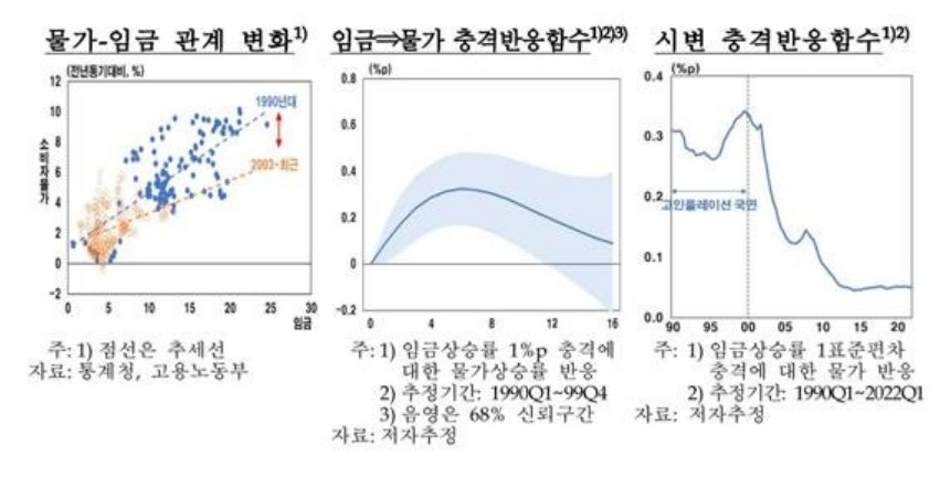 1990년부터 최근까지 자료를 이용해 충격 반응을 추정해봐도 임금 충격에 대한 물가 반응은 저인플레이션 국면과 비교해 고인플레이션 국면에서 컸다.