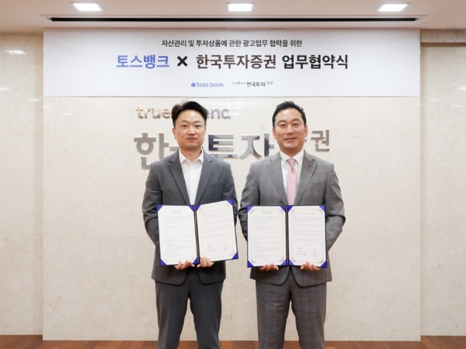 이날 여의도 한국투자증권 본사에서 진행된 '자산관리 및 투자상품에 관한 광고업무 협력을 위한 업무제휴' 협약을 통해 토스뱅크는 한국투자증권의 다양한 투자상품을 고객이 투자에 활용할 수 있도록 소개하는 광고 업무를 추진할 계획이다.