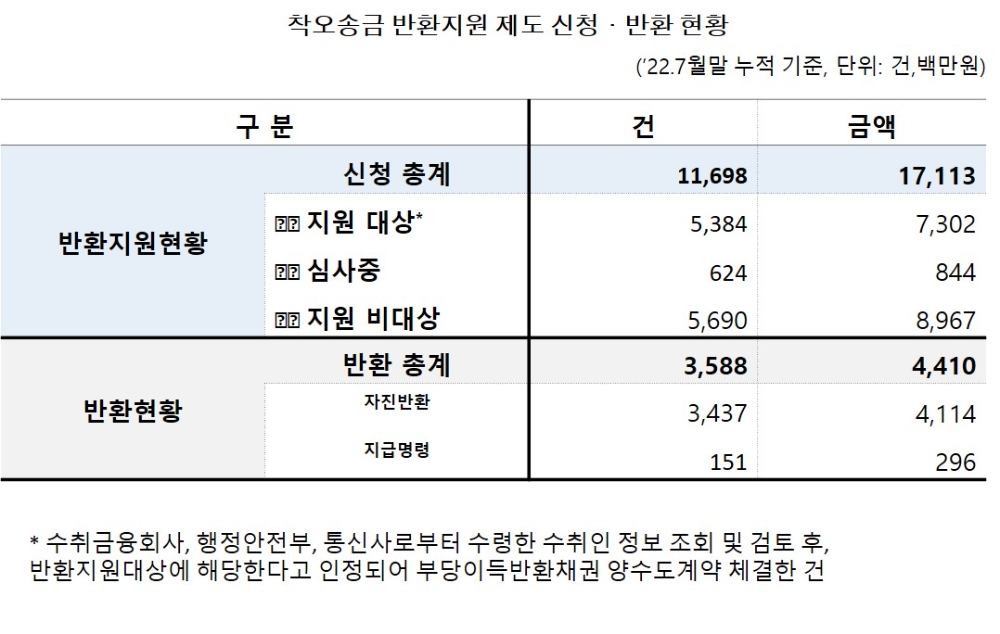 7월말 현재 자진반환(3437건) 및 지급명령(151건)을 통해 착오송금액 총 44억1000만원을 회수해 우편료, SMS 발송 비용, 지급명령 관련 인지대·송달료 등 소요비용을 제하고 착오송금인에게 42억3000만원을 반환했다.