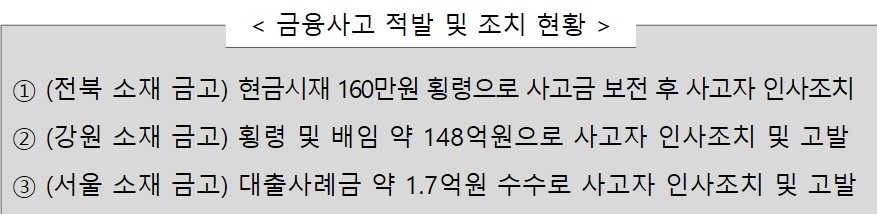 검사 결과 대부분의 금고는 경미한 업무절차 흠결 외에 특별한 이상은 없었으나, 3개 금고에서 △횡령사고(2개)와 △금품수수(1개)를 적발해 철저한 사고 조사 후 현재 사고자 징계 및 형사 고발 조치했다.
