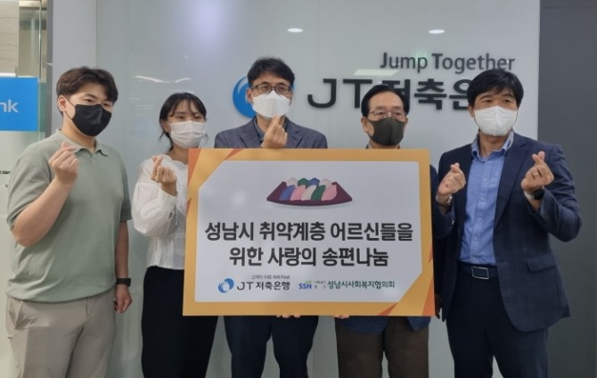 이미지 확대보기JT저축은행은 성남시 사회복지협의회와 경기 성남에 위치한 본사에서 지역 홀로 어르신을 위한 '동전 모아 송편 드림' 전달식을 갖고, 성남시 사회복지협의회 소속 복지관 홀로 어르신들에게 명절음식인 송편을 전달했다고 7일 밝혔다.