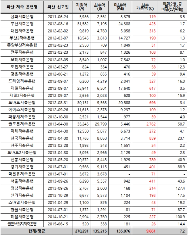 또한 회수율이 낮은 한주저축은행, 에이스저축은행, 부산·부산2저축은행들의 향후 회수 가능 금액 비율도 미회수액의 1~3%에 불과하다.