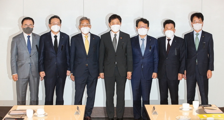 이미지 확대보기1일 5대 금융지주 회장들은 이날 김주현 금융위원장과 서울 중구 은행연합회에 모여 간담회를 가졌다. 이날 간담회에선 금융시장 상황에 대한 인식을 공유하고 금융지주사의 역할에 대해 논의했다.
