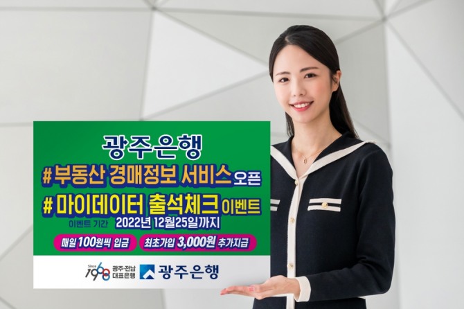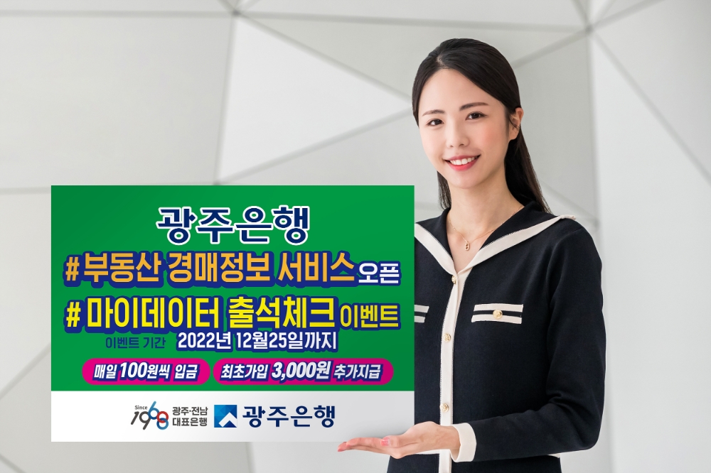 광주은행(은행장 송종욱)은 ‘부동산 경매 정보 서비스’를 새롭게 선보이고, 더불어 ‘마이데이터 출석체크 이벤트’를 실시한다고 밝혔다.전국 경매물건 검색 및 권리분석 등 ‘부동산 경매 정보 서비스’ 무료 제공
