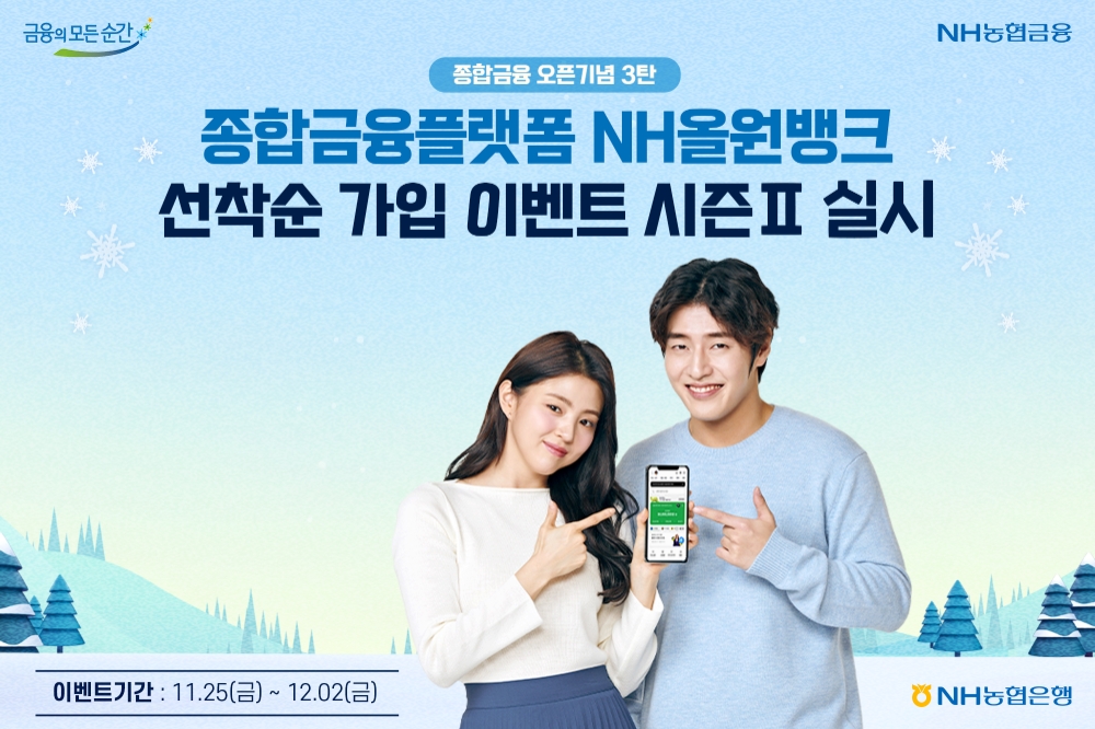 이번 이벤트도 시즌1과 동일한 방식으로 진행된다. 11월25일부터 12월2일까지인 이벤트 기간 중 NH올원뱅크에 신규 가입한 고객이 응모할 수 있으며, 응모 고객 중 선착순 총 5000명에게 스타벅스 아메리카노 모바일쿠폰 3잔을 제공한다.