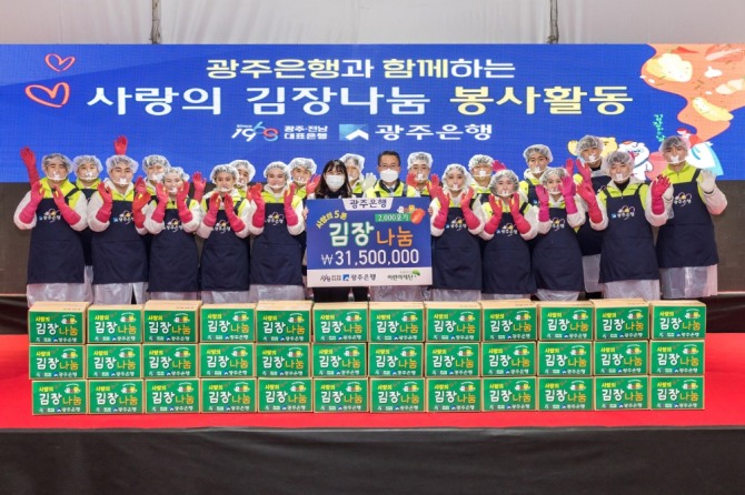 광주은행(은행장 송종욱)은 지난 5일 광주시 남구 임암동 광주김치타운에서 송종욱 광주은행장과 김현미 초록우산어린이재단 광주지역본부장, 광주은행 신입행원 등 30여명이 동참한 가운데 김장나눔 봉사활동을 펼쳤다고 밝혔다.지역 소외계층의 건강한 겨울나기를 위한 김장김치 담그기에