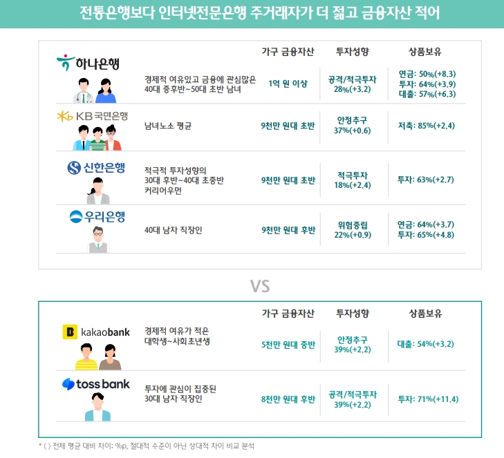 인터넷전문은행의 주거래 고객은 일반적으로 전통은행보다 금융자산이 적고 연령대가 낮았다. 다만 인터넷전문은행들 사이에서도 고객의 성향이 극명하게 갈렸다.