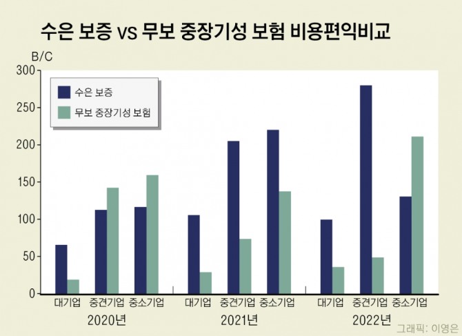 무보의 주장처럼 대외채무보증과 중장기성보험이 같은 기능이나 역할을 하는 중복 상품이라면 기업 입장에서 1억원이라는 비용(보험료 또는 보증수수료)을 갖고 무보에서는 평균 32억2030만원 보험금액 상품 가입을, 수출입은행에서는 98억4997만원 보증서 수령을 할 수 있다는 수치를 보였다. 2020년 중견 및 중소 기업, 2022년 중소기업의 비용편익만이 무역보험공사가 수출입은행을 앞설 뿐 수출입은행이 두 상품 간 3년 평균 비용편익은 3배나 높은 수준이다.