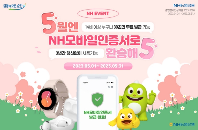이미지 확대보기이번 이벤트는 NH스마트뱅킹에서 NH모바일인증서를 최초 발급하고 로그인한 고객이 이벤트 페이지에 응모하면 추첨을 통해 ▲갤럭시 워치 5세대 40M(5명) ▲갤럭시 버즈2(10명) ▲스타벅스 아메리카노 T (5000명)을 제공한다.