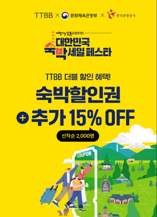 이미지 확대보기6월 30일까지 정부지원 대상 숙박 상품 이용시 3만원 또는 5만원의 숙박 할인권 혜택을 준다. ‘티티비비’ 애플리케이션 및 웹페이지를 이용시 최대 3만원까지 결제금액의 15%를 추가로 할인 해준다.