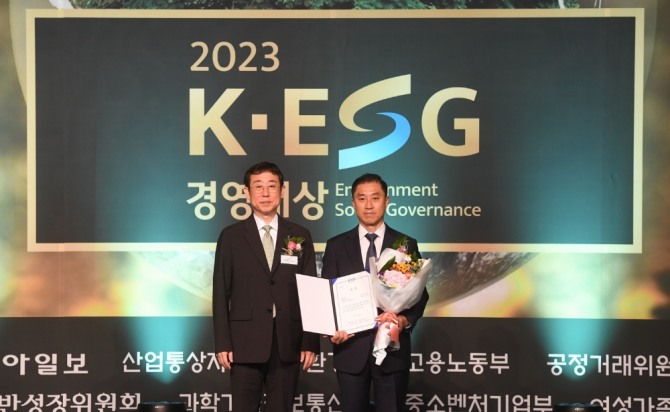 이미지 확대보기‘2023 K-ESG 경영대상’은 산업통상자원부 비롯 주요 국가 기관이 정보공시, 환경(E), 사회(S), 지배구조(G) 등을 종합 평가해 모범적인 ESG경영 실천 기업에 수여하는 상이다.