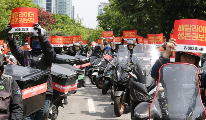배달노동자들이 지난 5월 10일 서울 여의도 산업은행 인근에서 라이더유니온이 개최한 '2023 라이더대행진'에 참가해 생종권보장이라 적힌 손 피켓을 들고 구호를 외치고 있다. 사진=뉴시스이미지 확대보기