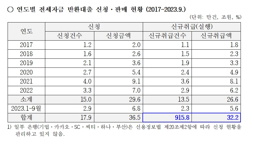 이미지 확대보기17일 강민국 국민의힘 의원실에서 금융감독원에 제출받은 자료에 따르면 지난 2017년부터 올해 9월까지 7년 동안 전세자금 반환대출 판매건수는 15만9000건을 기록했다. 취급액은 32조2000억 원에 달했다.