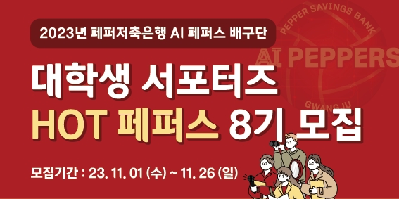 이번 핫페퍼스 8기는 12월 20일부터 내년 2월 20일까지 두 달간 AI페퍼스 배구단의 온·오프라인 홍보 기획 및 활동을 수행한다. 특히 사회적 거리두기 해제 이후 모집되는 첫 기수인 만큼 광주 홈경기장인 페퍼스타디움에서의 경기 직관 등 다양한 오프라인 체험을 실시할 계획이다. 아울러 AI페퍼스 배구단 앱인 'AI PEPPERS'의 콘텐츠 기획과 제작에도 참여한다.