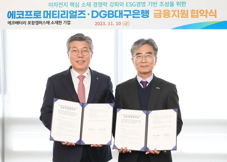 에코프로머티리얼즈를 비롯해 에코프로이엠, 에코프로씨엔지, 에코프로이노베이션, 에코프로에이피 등 포함캠퍼스 5개 계열사가 참여한 이날 협약에서 5개사는 시설·운영자금이 필요할 때 DGB대구은행으로부터 대출받을 수 있다. 양측은 대출이 필요한 상황이 발생하면 5000억원 범위에서 금액과 이자율 등을 협의할 예정이다.