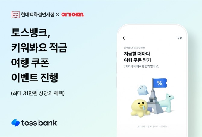 이미지 확대보기토스뱅크가 여행⠂여가 플랫폼 여기어때와 현대백화점면세점과 함께 오는 27일까지 ‘키워봐요 적금 여행 이벤트’를 진행한다.