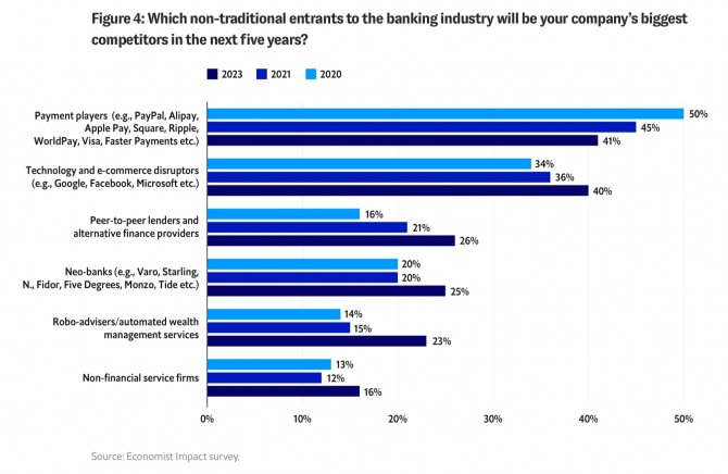 반면 페이팔·애플페이·알리페이 등 간편결제 기업을 주요 경쟁자로 꼽은 비율은 41%로 2020년 50%에서 9%p 하락했다. 이코노미스트 임팩트는 은행들이 기술과 금융 솔루션에 대한 접근성을 높이기 위해 핀테크 기업과의 협력을 강화하는 한편, 고객을 유치하기 위해 치열한 경쟁을 벌이고 있다고 분석했다.