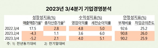 매출액 증가율은 제조업과 비제조업에서 전반적인 감소세를 보였다. 특히 비제조업은 2분기(-0.7%)에 비해 3분기(-3.1%) 감소폭이 확대되면서 성장이 둔화되는 모습이 나타나고 있다. 비제조업은 전기가스업(-1.9%), 도·소매업(-7.0%) 등을 중심으로 하락했다.