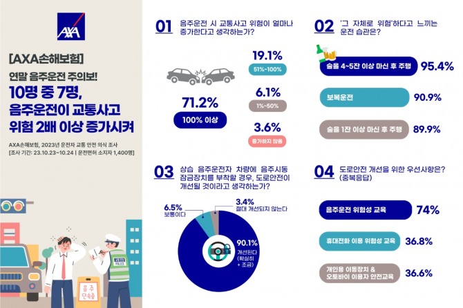 이어 음주운전 시 교통사고 발생 위험성에 대해 묻는 질문에서는 전체 응답자의 71.2%가 사고 위험이 2배 이상 증가한다고 답하며, 10명 중 7명은 음주 후 운전이 교통사고 발생의 주요한 원인 중 하나로 여기고 있는 것으로 조사됐다. 음주운전이 교통사고 위험 증가에 영향을 미치지 않는다고 응답한 사람은 3.6%에 불과했다.