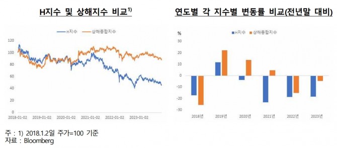 한은은 홍콩 H지수가 코로나 이전 고점 시기인 2018년 1월 26일 대비 현재(2023년 12월 11일)까지 약 59% 급락한 반면 중국 본토 상하이지수는 16% 하락에 그쳐 뚜렷한 차이를 보인다고 분석했다.