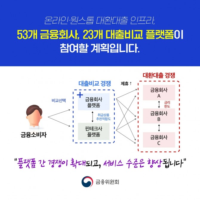 금융위 관계자는 “그간 각 금융회사는 대출고객 유치를 위해 경쟁을 확대해 왔다”며 “대환대출 인프라 구축 이후 주요 은행들은 금리 경쟁력을 높이기 위해 더 낮은 금리의 신규·대환 대출상품의 공급을 늘려 왔다”고 설명했다.