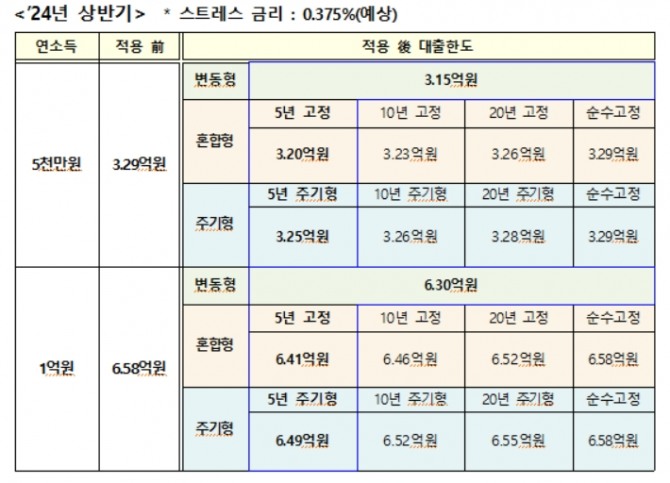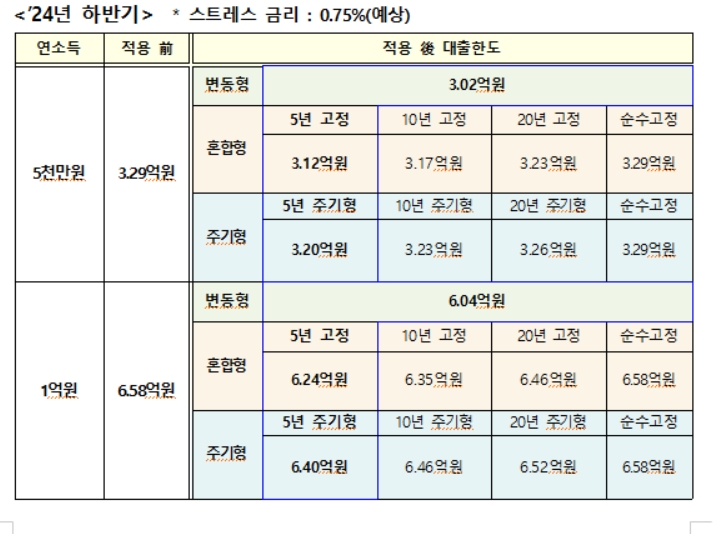 2025년부터는 스트레스 금리가 100% 적용되므로 1.5%p의 가산금리가 적용되는데 변동금리 대출한도는 기존 보다 무려 16% 줄어든다. 혼합형(5년)과 주기형(5년)도 각 각 10%, 6% 한도가 감소한다.