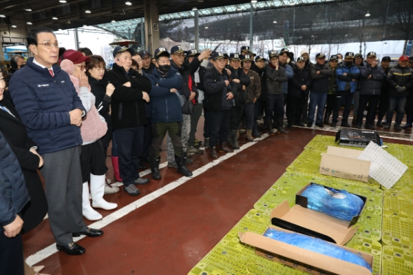이미지 확대보기노동진 수협중앙회장이 2일 새벽 서울 강서구 수협 강서공판장에서 새해 첫 경매인 초매 현장을 살펴보고 있다. 사진=수협중앙회
