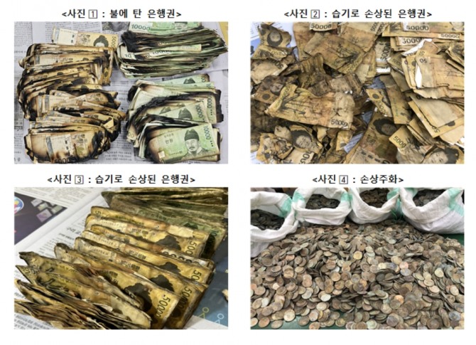 최근 서울에 사는 이모씨는 자택 화재로 불에 탄 지폐 1910만원을 한은에 방문해 새 돈으로 바꿔갔다. 또 전남에 사는 홍모씨는 땅속에 묻어두었다가 습기로 인해 부패한 지폐 1547만5000원을, 인천에 사는 이모씨는 습한 장소에 장기간 보관하여 부패한 지폐 1972만5000원을 새 돈으로 교환했다.