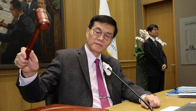 이창용 한국은행 총재가 22일 오전 서울 중구 한국은행에서 열린 금융통화위원회에서 의사봉을 두드리고 있다. 사진=연합뉴스