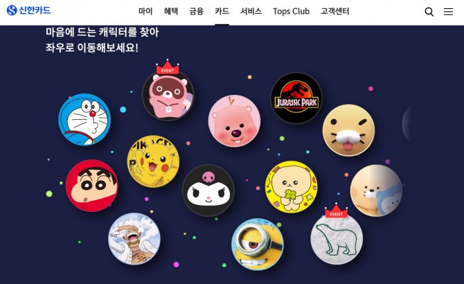 현재 국내 카드사들 중 캐릭터 카드 마케팅에 가장 공을 들이는 건 신한카드다. 현재 신한카드가 판매 중인 캐릭터 카드는 짱구, 원피스, 포켓몬스터, 도구리, 미니언즈, 산리오캐릭터즈, 쥬라기파크, 잔망루피, 곰표(표곰이), 도라에몽 등 총 13여 종이다. 또 신한카드는 자사 홈페이지와 앱 내에서 모든 캐릭터 라인업을 확인할 수 있도록 하는 등 차별화된 경험에도 힘쓰고 있다.