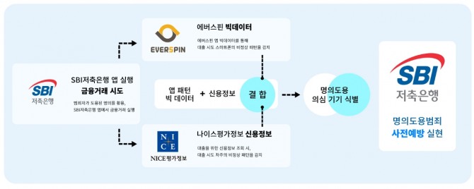 SBI저축은행은 신분증 사본 판별시스템, 통신사 개통 정보 확인 등 신분증 진위확인 및 휴대폰 도용 여부를 판단해 왔다. 추가적으로 이번 신기술 도입을 통해 기존에 수집한 정보 이외에도 스마트폰 앱 설치, 이용 패턴 등을 바탕으로 비정상 징후를 탐지하고, 나이스평가정보의 신용정보를 결합해 금융 상품 신청 단계에서 명의도용 여부까지 탐지할 수 있다.