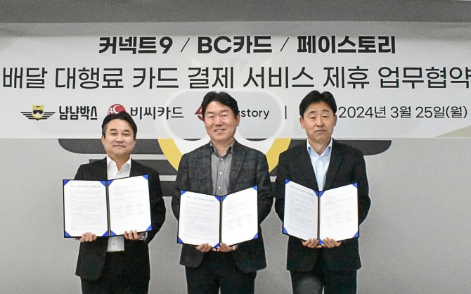 이미지 확대보기BC카드가 배달 전문 플랫폼 냠냠박스 운영사 ‘커넥트9’와 전자지급결제대행(PG)사 ‘페이스토리’와 배달대행료 카드결제 서비스 제휴 업무계약을 체결했다고 26일 밝혔다.