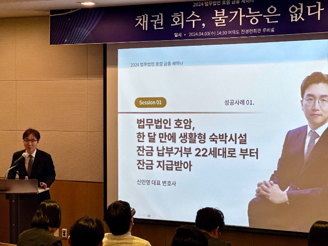 이미지 확대보기‘채권 회수, 불가능은 없다’라는 주제로 개최된 이번 세미나는 국내 주요 금융 및 부동산 업계 관계자들을 대상으로 채권 회수 및 수분양자 이탈 방지 등에 대한 성공 사례를 소개하며 진행됐다. 호암의 신민영 대표변호사는 생활형 숙박시설의 잔금 미납부 문제를 해결한 사례에 대해 발표했다. 특히 이 과정에서 일부에서 잘못된 조언을 제공해 잔금 납부를 거부하는 수분양자가 늘었다고 지적했다. 신 변호사는 정확한 법률 정보 제공을 통해 수분양자의 이해를 돕고, 계약 불이행의 위험성을 알리는 등 다양한 방식을 종합적으로 적용해 계약 이행률을 높일 수 있었다고 강조했다.