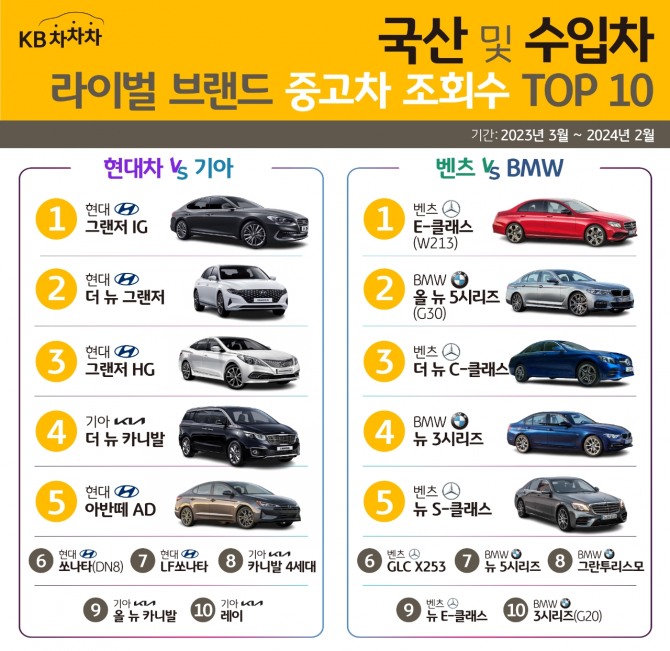 이미지 확대보기이번 분석은 KB차차차 이용자를 대상으로 작년 3월부터 올해 2월까지 1년간의 매물 조회 데이터를 분석하여 순위를 산출했다.
