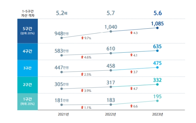 2023년 자산액 증가폭도 완만해지면서 1~5구간의 자산 격차도 2021년 8.4배에서 2023년 7.2배로 감소했다.