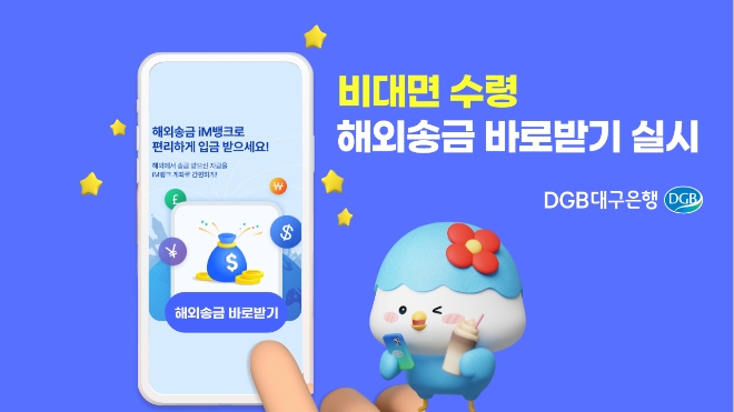 이미지 확대보기‘해외송금 바로받기'는 DGB대구은행 모바일 앱 ‘iM뱅크’를 통해 고객들이 비대면으로 해외송금을 빠르고 간편하게 수령할 수 있는 서비스다.