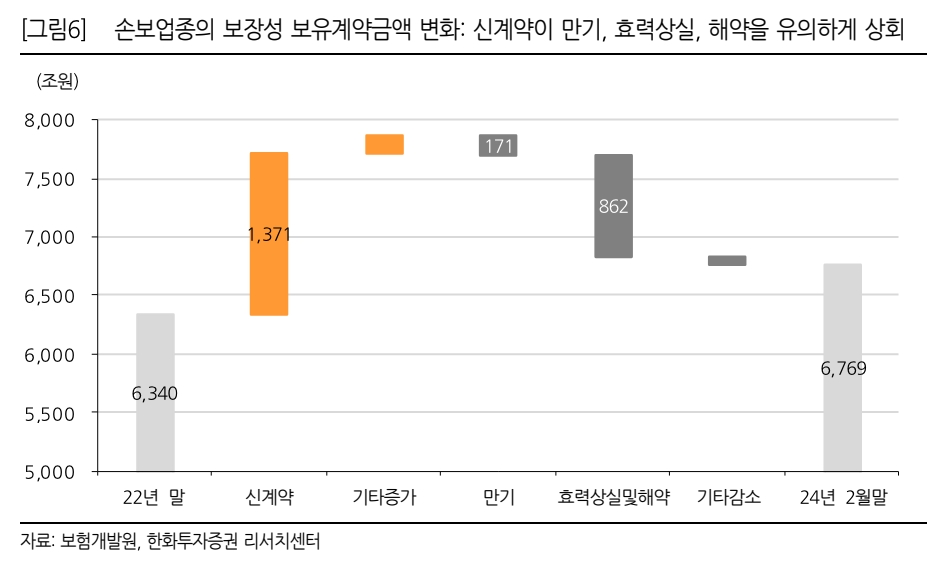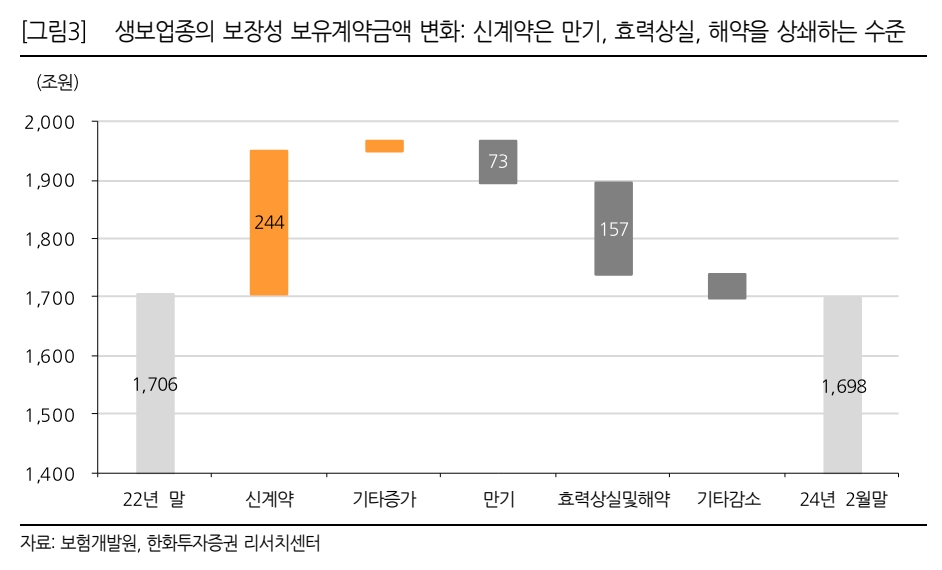 지난해부터 보험업계에 도입된 신 국제회계기준(IFRS17)에서 가장 중요한 실적지표인 보험계약서비스마진(CSM) 증가가 생명보험사들 사이에서는 보유계약 증가로 이어지고 있지 않고 있다는 지적이 나왔다.29일 한화투자증권의 김도하 연구원이 발행한 보고서에 따르면 생명보험사들은 2022년 말 이후 14개월간 약 244조원 규모의 보장성 신계약을 창출했으나 만기와 효력상실, 해약 등으로 보유계약 금액은 오히려 소폭(약 8조원) 감소한 것으로 나타났다.