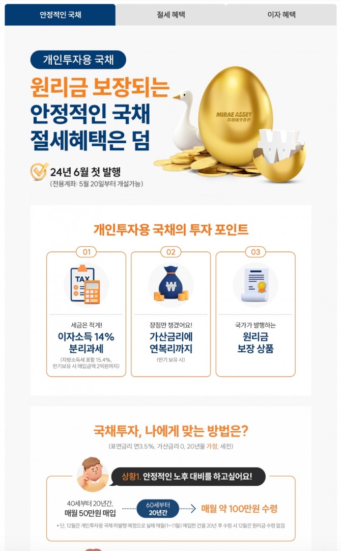 이번에 판매된 국채의 만기 수익률은 10년물 44%(세후 37%), 20년물 108%(세후 91%)다. 중간 이자를 지급하지 않지만 10년·20년 만기를 채워 보유하면 가산금리 및 연 복리를 지급한다.