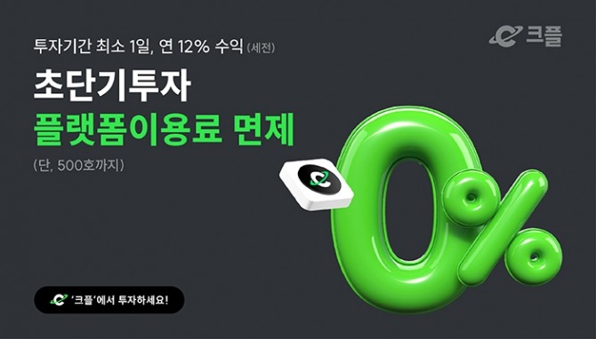 이미지 확대보기크플에서 판매 중인 초단기투자는 단 하루만 투자해도 연 12%(세전)의 높은 이자율을 챙길 수 있어 개인 및 법인 투자자들의 열띤 투자 오픈런이 이어지고 있다고 회사 측은 설명했다.