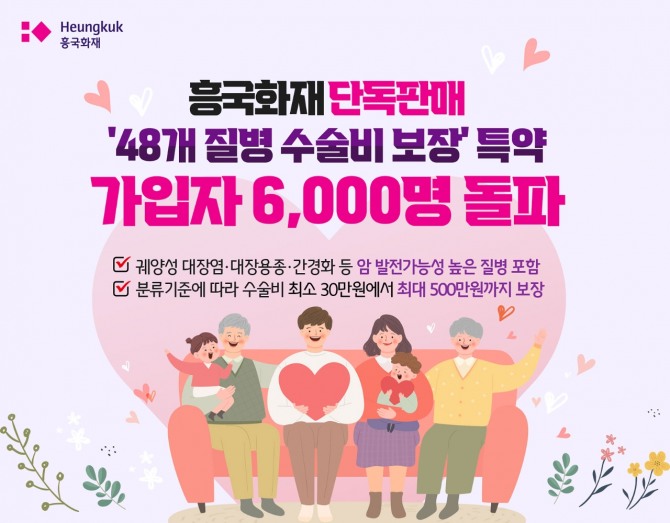 ‘48개 질병 수술비 보장 특약’은 흥국화재가 최초 개발해 단독으로 판매 중이며, 현재 총 7개 상품에 탑재돼있다. 지난 4월 출시한 △흥Good 모두 담은 암보험 PLUS에서 처음으로 선보였으며, 이후 △흥Good 모두 담은 여성MZ보험 △흥Good 간편한 6090 청춘보험 △흥국화재 든든한 325 간편종합보험 △흥국화재 든든한 335 간편종합보험 △흥국화재 든든한 355 간편종합보험 △흥Good The건강한 종합보험에도 실렸다.