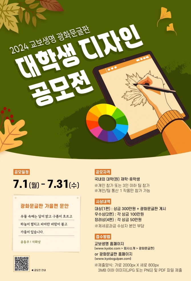 대상 수상자에게는 장학금 300만원, 우수상과 장려상은 각각 100만원과 50만원의 장학금이 지급된다. 대상 수상자가 디자인한 광화문글판 가을편은 오는 9월부터 3개월간 광화문 교보생명빌딩과 강남 교보타워 등에 실제 게시된다.