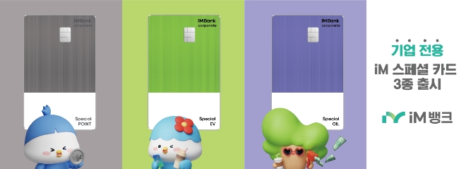 iM뱅크 관계자는 "시중은행 전환 이후 처음으로 선보이는 기업고객 전용 카드 신상품을 3종으로 출시, 다양한 업종에서 고객 선호를 만족시키고자 했다"며 "특수 목적성 및 범용성 포인트 카드를 대거 출시해 기업고객의 유형별 니즈를 충족하고자 하며 앞으로도 다양한 카드 상품 및 서비스를 선보이겠다"고 말했다.