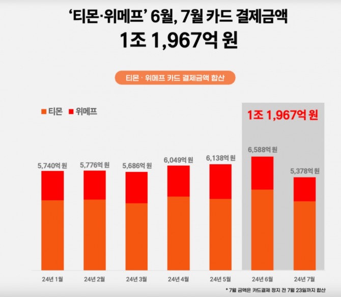 모바일인덱스는 6월 티몬과 위메프의 카드 결제액을 각각 4675억8000만 원, 1913억 원으로 추산했다. 7월에는 각각 3982억 원, 1396억 2000만 원으로 추산됐다. 이는 카드결제 정지 전인 7월 23일까지의 내역을 반영한 수치다. 두 달간의 총 카드 결제액은 1조1967억 원에 달할 것으로 예상된다.