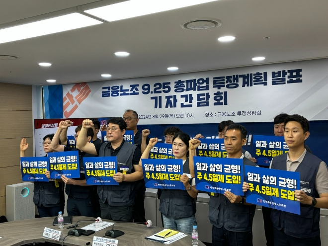김형선 금융노조 위원장은 “이번 총파업은 ‘주 4.5일제를 위한 최초의 산별 총파업’이라는 의미를 가진다”고 말했다.