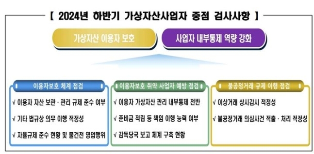 이번 검사의 주요 초점은 가상자산이용자보호법(가상자산법)이 시행된 이후 주요 사업자의 법규상 의무 이행 점검과 이용자 보호, 불공정 거래 감시 체계 구축 여부다.
