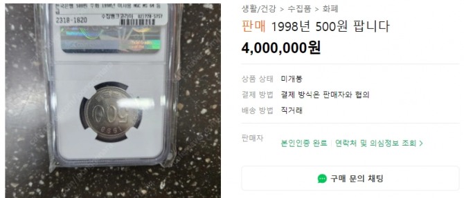 17일 중고거래 사이트에 따르면 1998년 주조된 500원 동전 가격은 주화 상태에 따라 200만원에서 900만원까지 거래되고 있다.