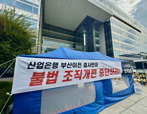 이미지 확대보기산은 노조는 19일 여의도 산은 본점 출입구 앞에서 불법 조직개편 중단을 촉구하는 투쟁을 시작했다.
