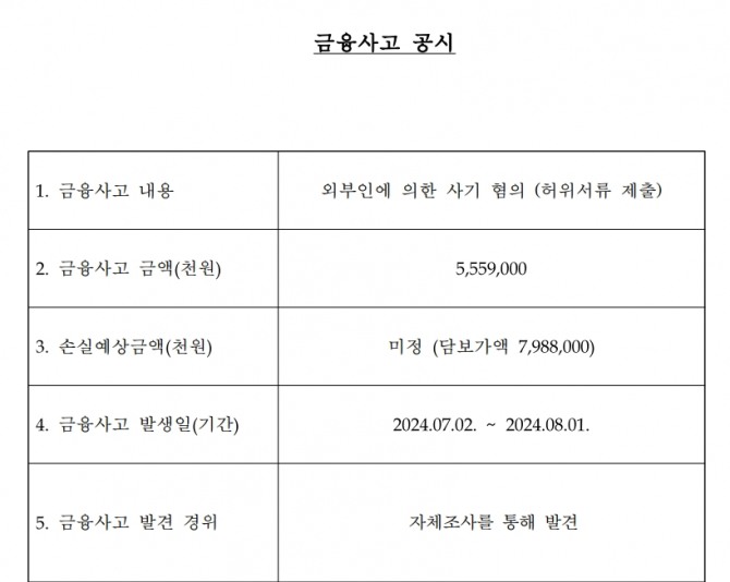 이미지 확대보기2일 금융권에 따르면 우리은행은 외부인의 허위 서류 제출에 따른 금융사고가 발생했다고 지난달 30일 공시했다. 사고 금액은 55억5900만원, 사고 발생 기간은 지난 7월 2일부터 8월 1일까지다.