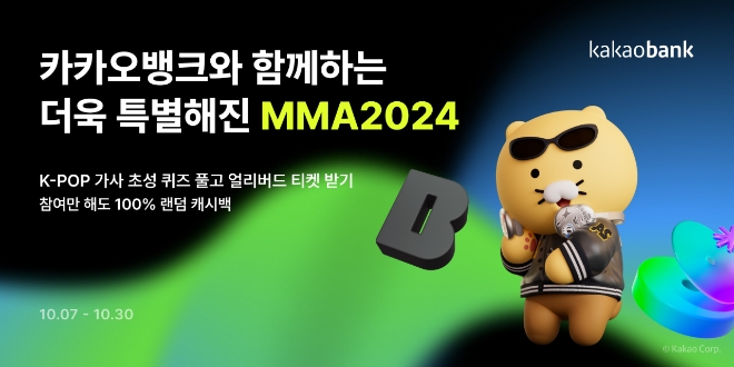 이미지 확대보기카카오뱅크는 MMA2024 타이틀 스폰서 참여를 기념해 초대권 증정 사전 이벤트를 진행한다고 7일 밝혔다.
