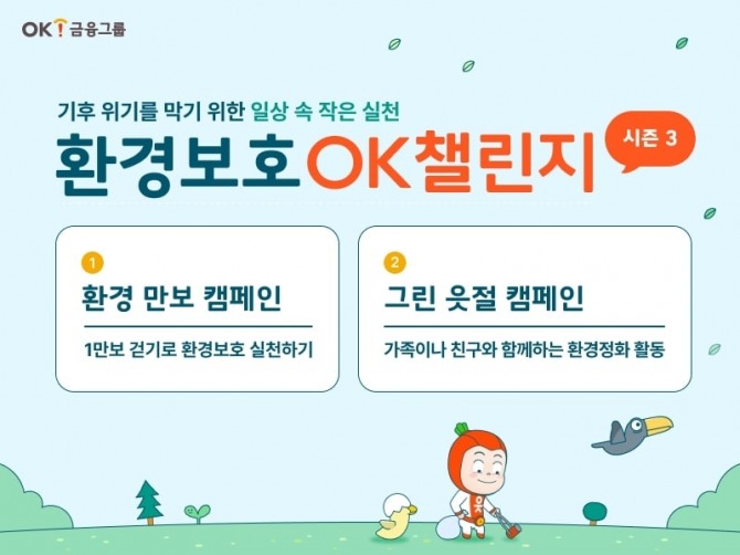 이미지 확대보기OK챌린지는 ESG(환경·사회·지배구조) 경영의 일환으로 OK금융그룹 임직원들이 일상에서 환경보호 활동을 실천하며 기후위기 극복에 기여하고자 기획한 캠페인이다.